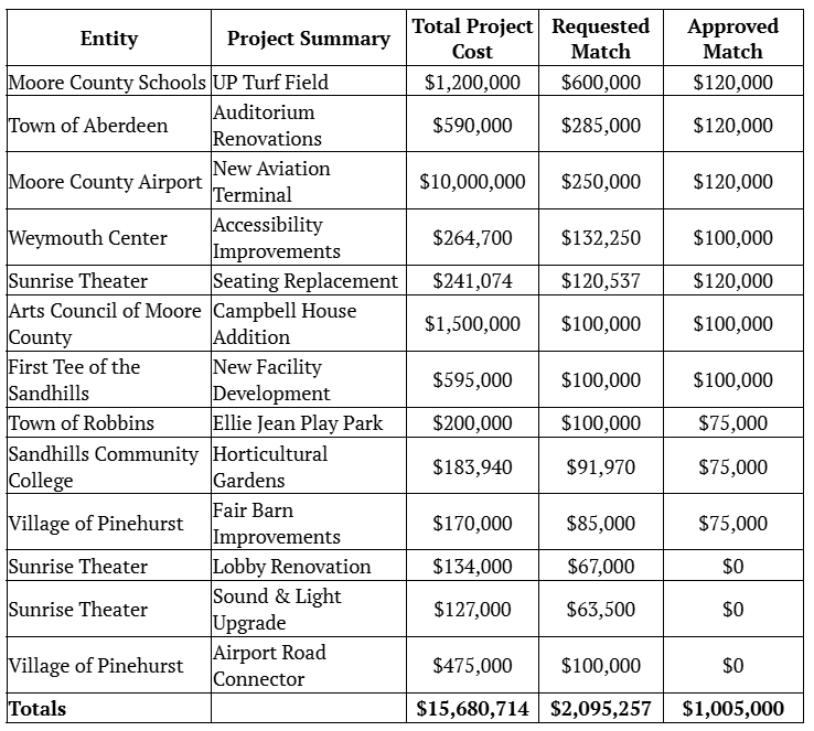 the Village of Pinehurst and Sunrise Theater, where the most impactful project was advanced for funding consideration. Of the 13 projects reviewed, 10 were recommended for funding. The five-person committee was composed of three current CVB board members and two independent community leaders unaffiliated with the CVB.