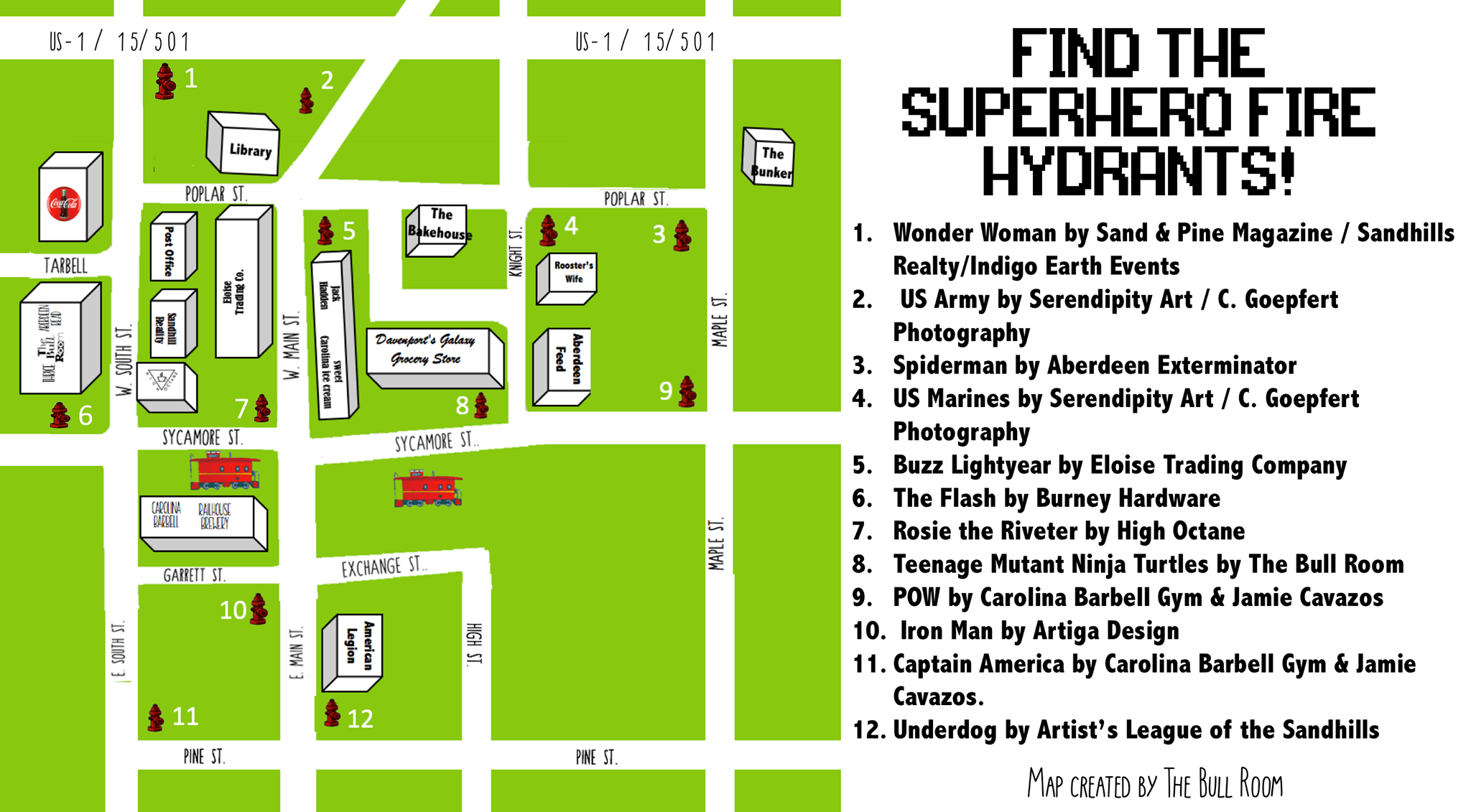 The Carthage Digital Video Mural Trail, the first of its kind in North Carolina, brings art and history to life in downtown Carthage. Five murals, all within walking distance of one another, are paired with bronze-plated QR codes that link to short videos about each piece, produced by the CVB. Five of the murals were created by artist Scott Nurkin, and one was painted by Dan Dreyer. Together, they showcase the history, culture, and notable figures of this Moore County town in a way that’s both colorful and interactive.