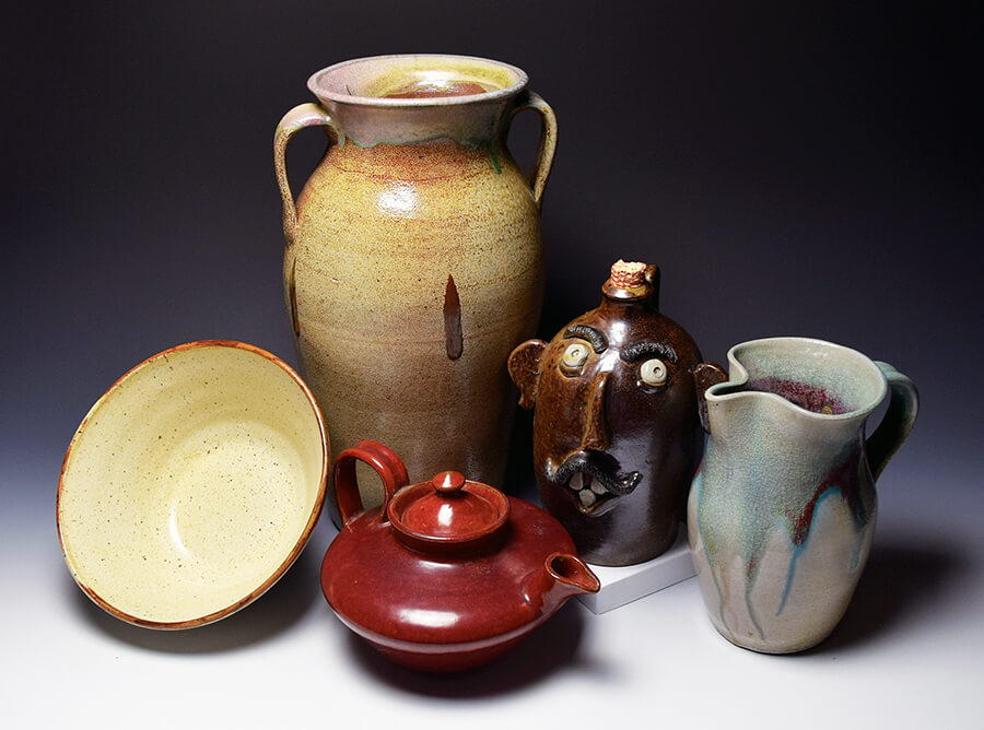 | Luck’s Ware continues the ancient art of wheel-thrown pottery near Seagrove, the “Pottery Capitol” of North Carolina. Visitors can experience the entire process from the mixing of the clay to the finished ware. Sid Luck, a fifth generation potter, and sons, Jason and Matt, continue the Luck pottery tradition. This pottery tradition is observed in the shape of many old time functional stoneware pieces such as candle holders, churns, jugs, pitchers, and teapots. Sid digs local clay to use in some of his pottery. One of the wheels he still uses for turning was originally in his father’s shop.